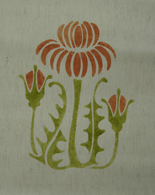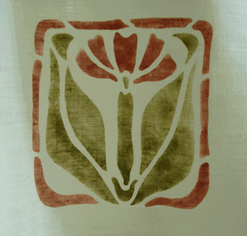 Large Iris: Since this stencil is 8" high, we usually use it as a double medallion, but it could also be a border on a large shade or curtain. It's in loden and dark red here, but as an iris could be any color! $40.00 per motif