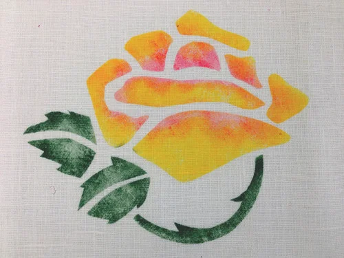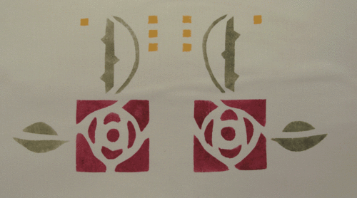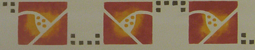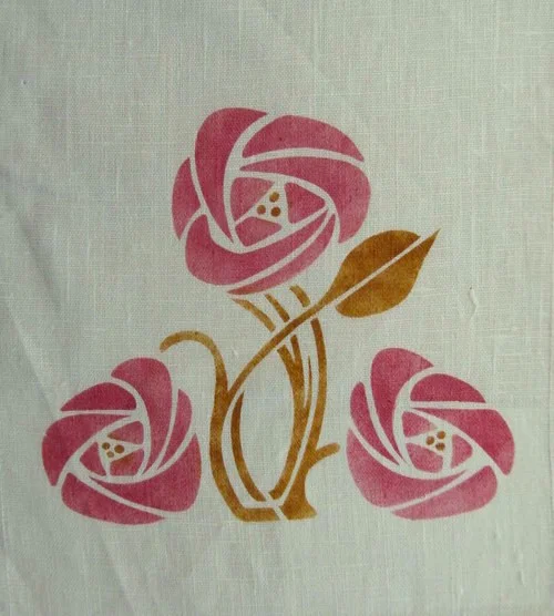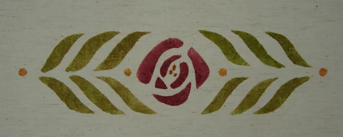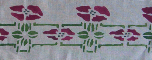 Small Rose Stencil: A horizontal medallion or border adapted from our small runner design, shown here in wine, antique gold and loden on natural handky linen, 2 1/2" high x 9" wide. $40.00 per motif