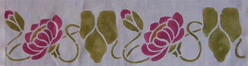 Water Lily Border: With a repeat of 4 1/2 inches high x 9 1/2 inches wide. Shown in stock in rose, antique gold and loden. Looks like a chrysanthemum when done in dark red! A template is also available for this design. $45.00 per repeat