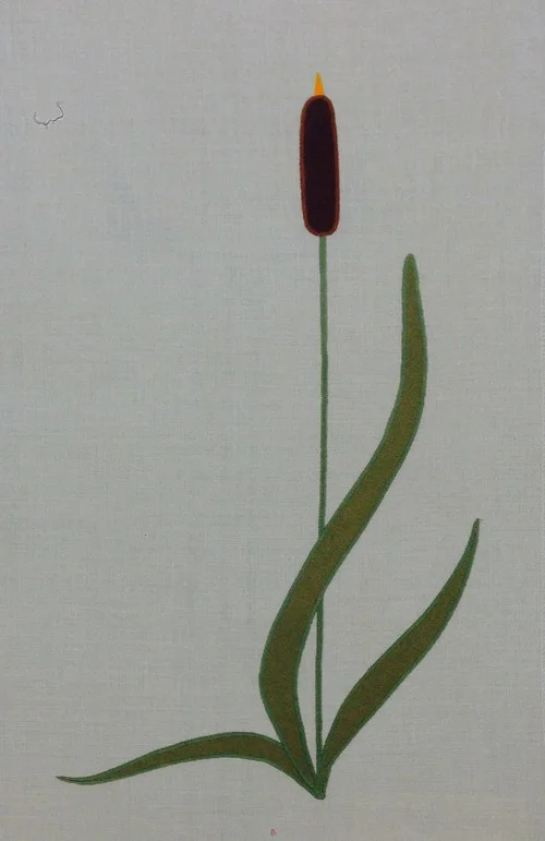 Cat Tail: A corner design that can face either way as you wish (mirrored), here in loden, brown & bright green, 19" high although the stem length can be adjusted. $35.00