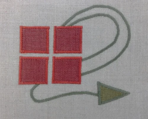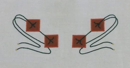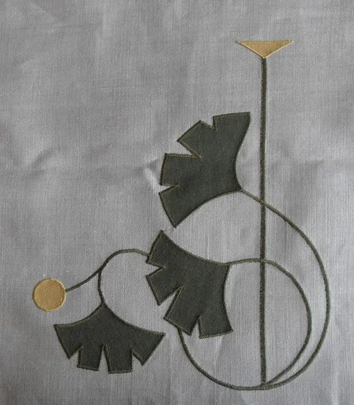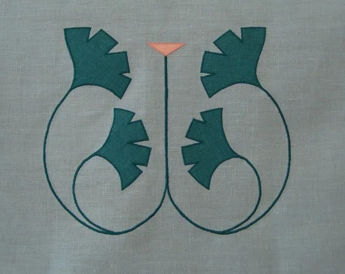 Prairie Grass: a highly abstracted design typical of the Prairie School, and inspired by the unmowed tall grass along the highways of the upper Midwest. All stitching is one color, like loden green with matching squares. Choose another color for the chevrons, like teal blue, three inches wide, length proportional to curtain panels, $45.00 per motif.
