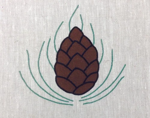 Pine Cone: A medallion that can be turned at at45 degree angle to become a corner motif,shown here in brown, black and sage, 6 1/2" from bottom to highest needle, $35.00 per motif.