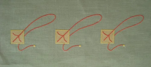 Ivy Corner can easily be used as a border, but it also works well at the inside or leading edge of double paneled curtains. Leaf is one inch square, $20.00 per motif, $40 per pair