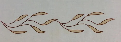 Willow Border small: 13" wide x 4 1/2" high. Shown here in antique gold with brown stitching. $36.00 per repeat of one branch.