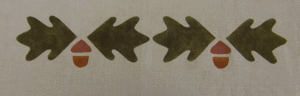 Acorn Border: A cheery, informal version of the popular motif, show here in loden, terra cotta & antique gold, 7" repeat. $40.00 per repeat. Single acorn wth leaves for $20.00.