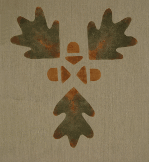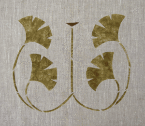 Ginkgo Medallion: an Arts & Crafts classic. 12 1/4"W x 10 1/2" H. A good option for bedding among other uses, here in loden & brown on oatmeal linen. Available as a template. $40.00 per motif.