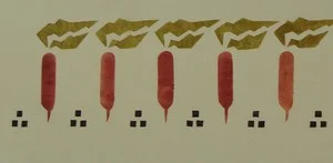 Daikon Border: Show here in rust, bright loden and black on ecru shade fabric. Great for a kitchen or conservatory, or maybe a greenhouse! One repeat is 4 1/2" high by 2" wide. $40.00 per repeat.