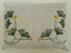 Ginkgo Corner: At right. Shown with two on a pillow in forest & antique gold on oatmeal linen, sideways to how we normally position it...but quite nice! About 12 1/2" wide x 12" high as shown here. Available as a template. $40.00 per motif.